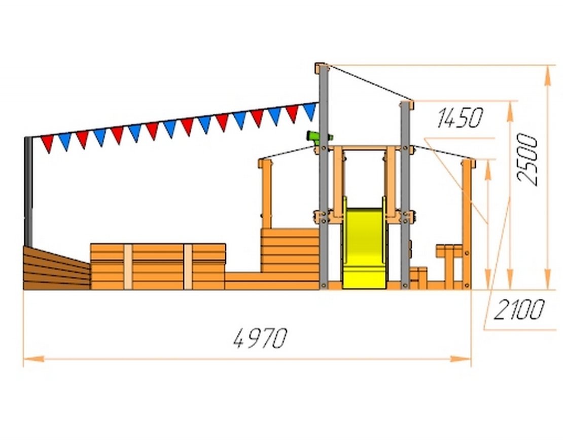 Детская песочница с крышкой-лавочкой и кораблик, включающий в себя штурманскую рубку и капитанский мостик с горкой с высоты 900 мм с флажками.