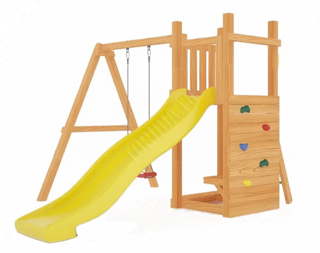 Площадка наполнит досуг детей энергией и радостью. Она компактная и займёт всего лишь несколько квадратных метров участка дачного или загородного дома. Покрытие с антисептиком защитит натуральные составляющие от непогоды (наносится самостоятельно).