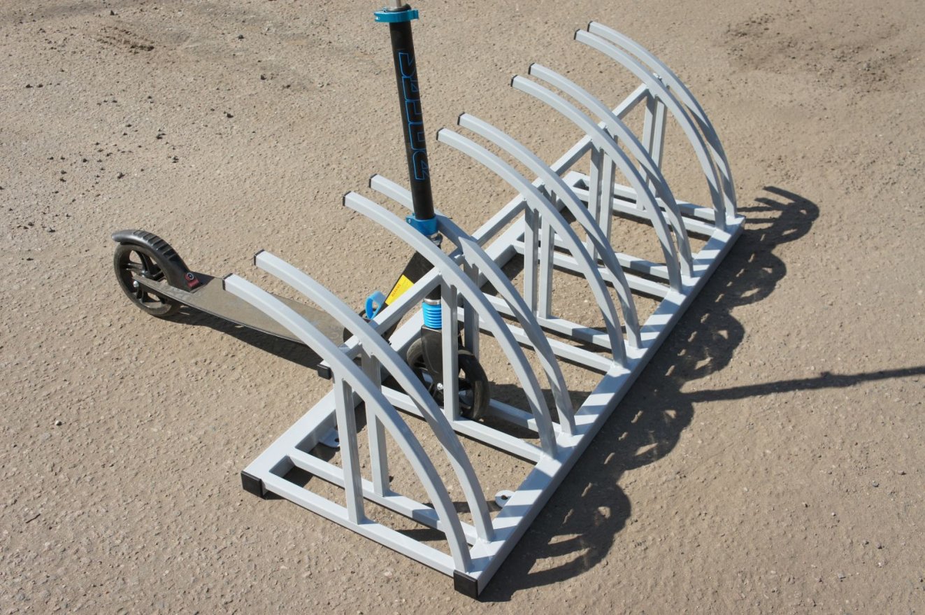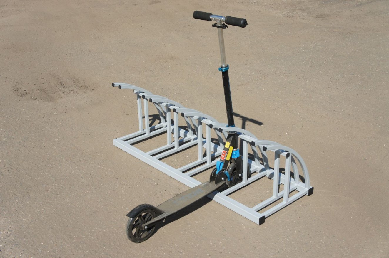 Парковка для самокатов устанавливается возле торговых центров, кафе, в парках, на детских площадках и так далее. Особенности изделия: