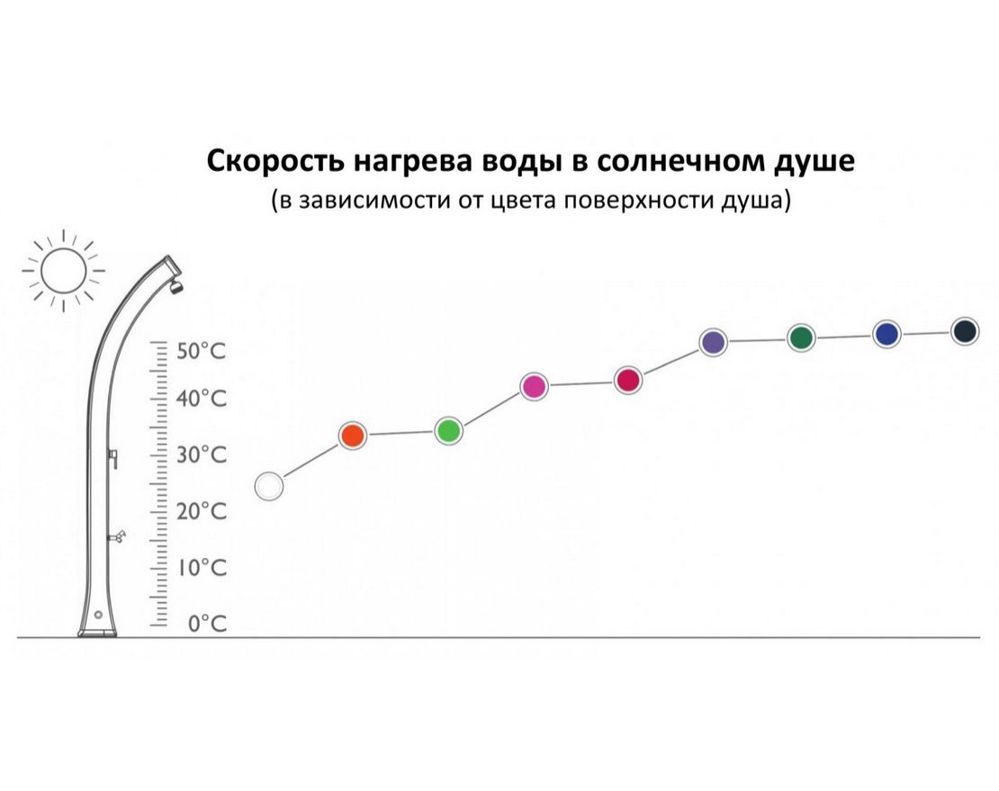 Принцип работы максимально прост, что делает солнечный душ популярным атрибутом пляжных курортов. Вода, хранящаяся в корпусе душа, нагревается за счет солнца. Нагретая вода смешивается с холодной водой из источника постоянного водоснабжения (или из садового шланга). При помощи смесителя возможна регулировка потока горячей и холодной воды до температуры комфорта.