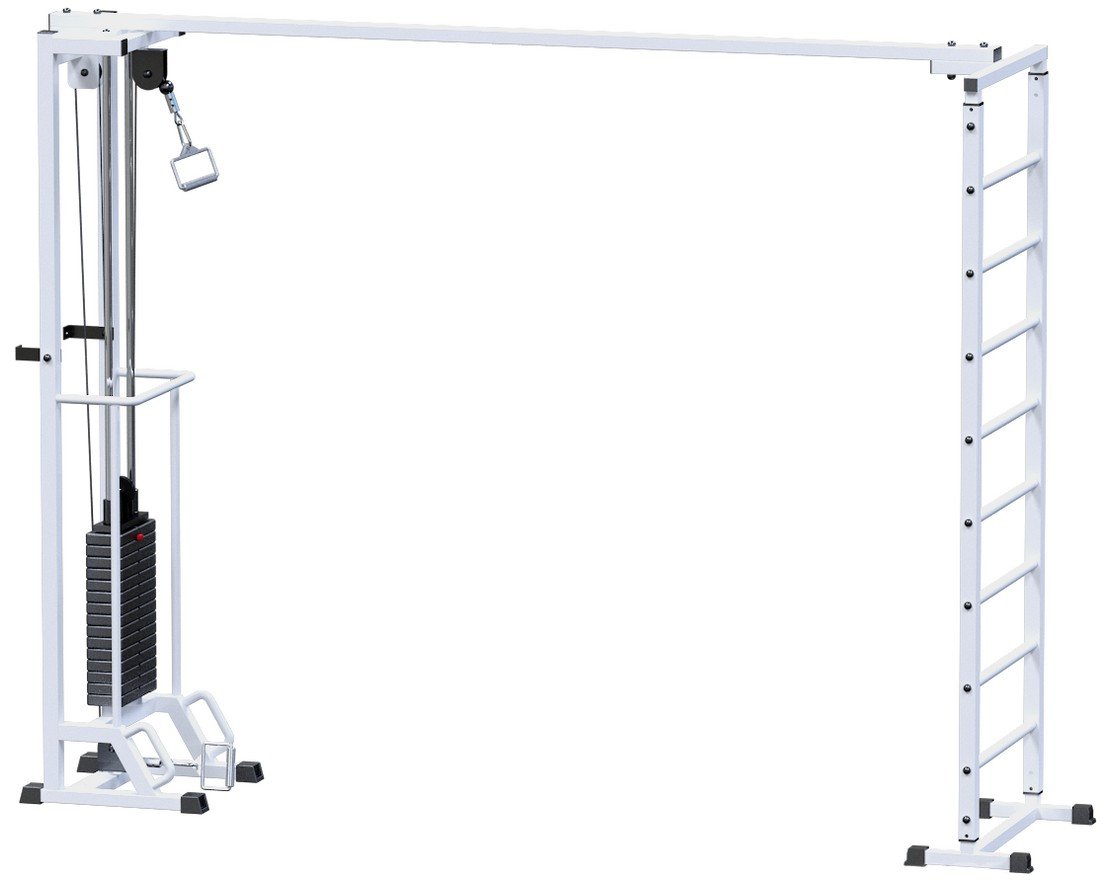 Грузоблочный стек тренажера состоит из металлических обрезиненных плит весом по 5кг, и хромированных направляющих. Изменение нагрузки происходит при помощи металлической иглы(фиксатора). Для приведения в движение грузов используется трос 5 мм в пвх оплетке с усилием на разрыв 500 кг с максимальной нагрузкой – 800кг.